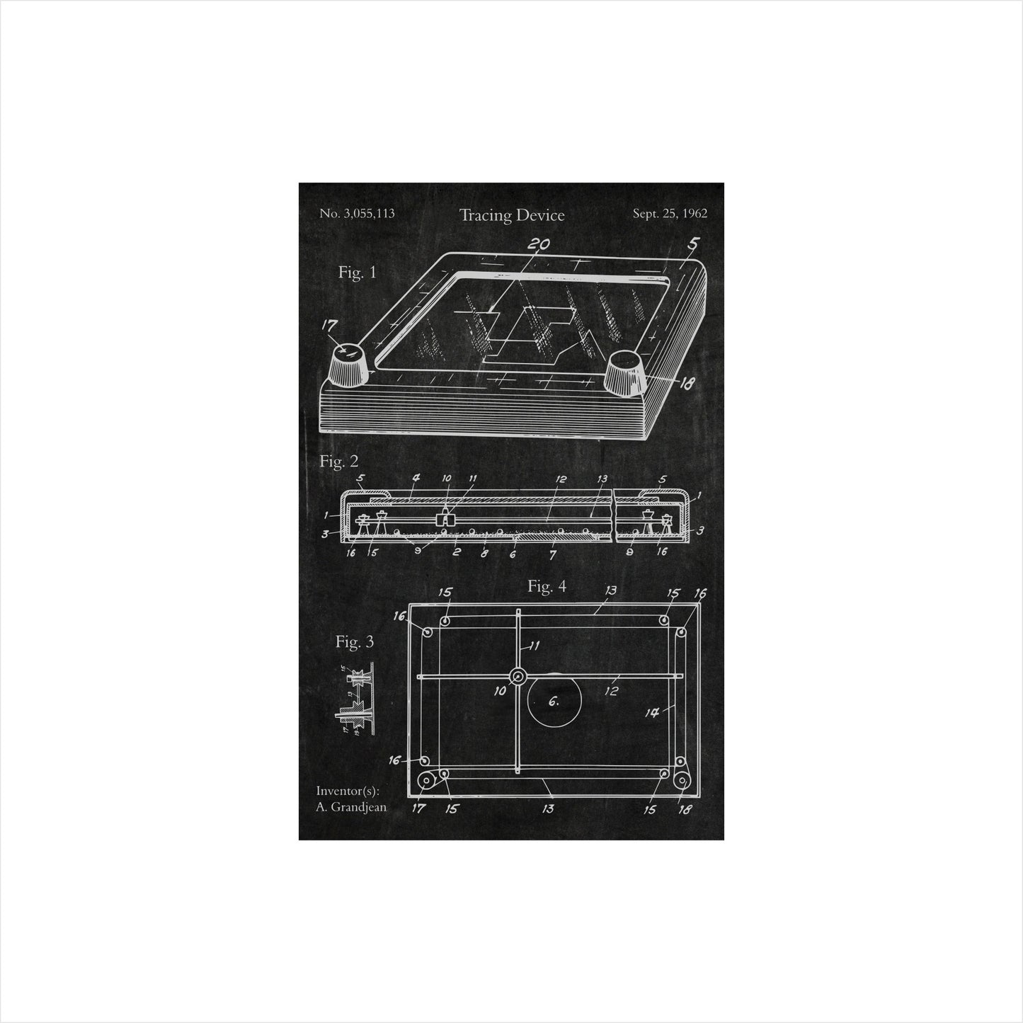 Our Patent Art Print Collection is a customer favourite. This Retro Toy Tracing Device Patent, aka Etch A Sketch Patent, is available as a print on it's own or framed with matting in one of our top ten best selling frame moldings.